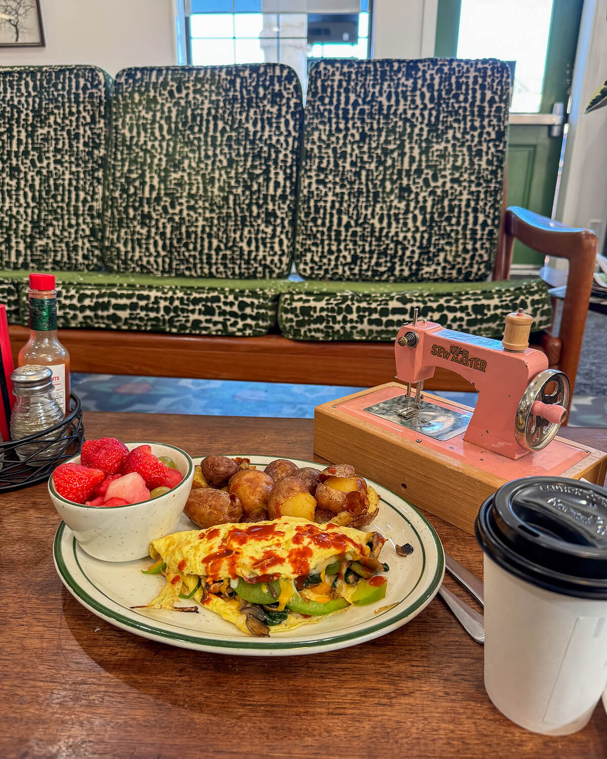 plate with omelette, potatoes and cup on fruit on tables inside Bee's Bakery Cafe in Oakhurst CA