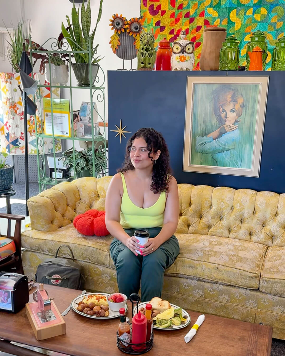 woman sitting on retro couch surrounded my retro decor inside Bee's Bakery Cafe in Oakhurst CA